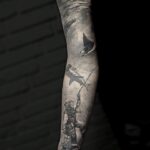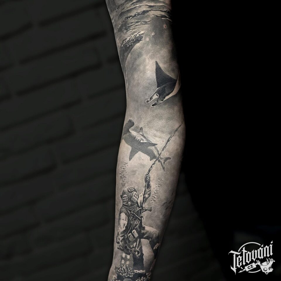 Tetování zvířata a příroda, potápěč a žraloci, moře na předloktí