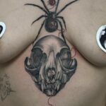 Tetování zvířata, beruška, lebka a pavouk mezi prsa