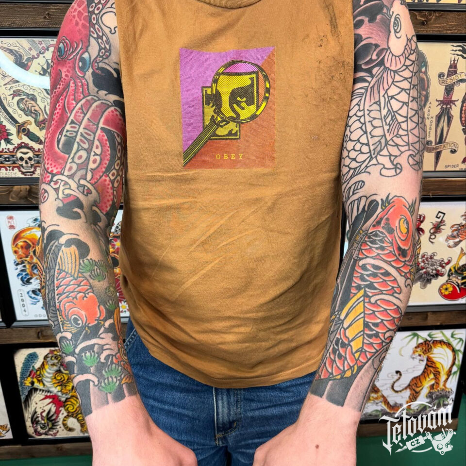 Tetování zvířata, chobotnice a ryby, kapři, rukáv