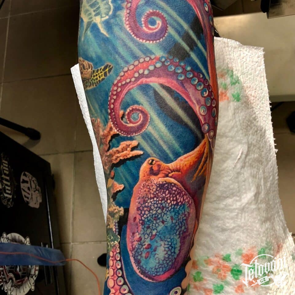 Tetování zvířata, chobotnice na lýtku