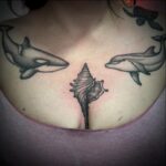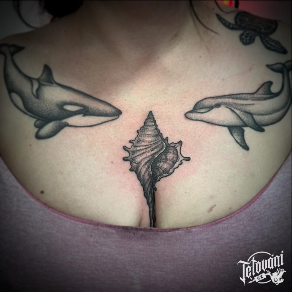 Tetování zvířata, delfíni, předměty, mušle na hrudi