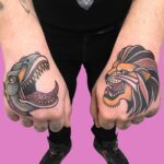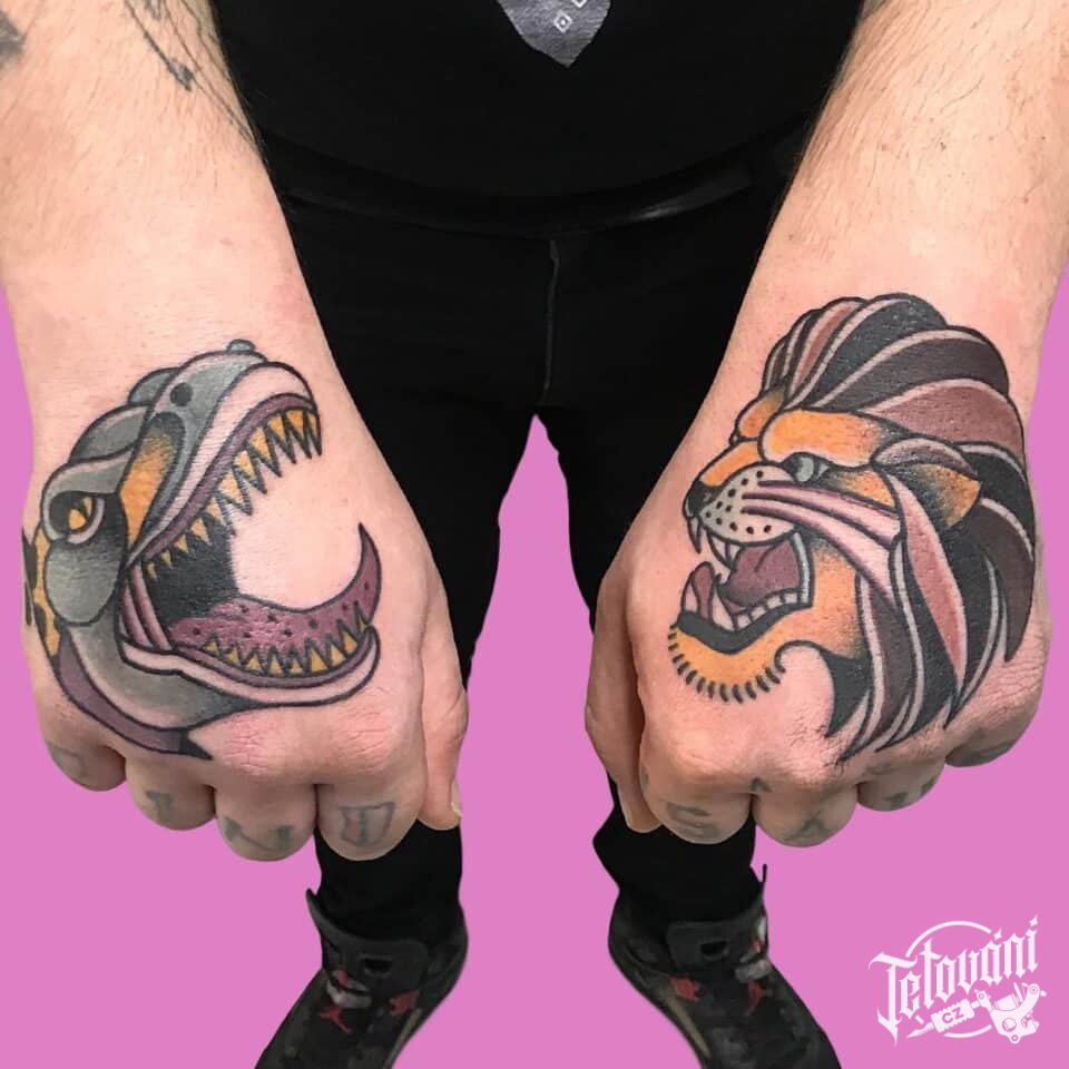 Tetování zvířata, dinosaurus a lev na hřbetu ruky