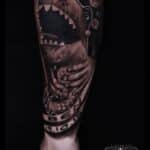 Tetování zvířata, dinosaurus a ruce, nápisy, datum a jméno na předloktí