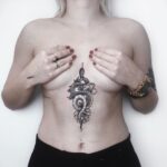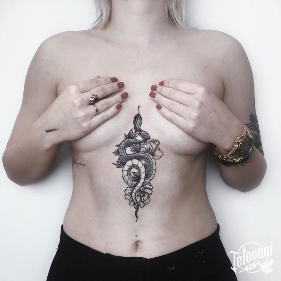 Tetování zvířata, had a květiny mezi prsa