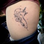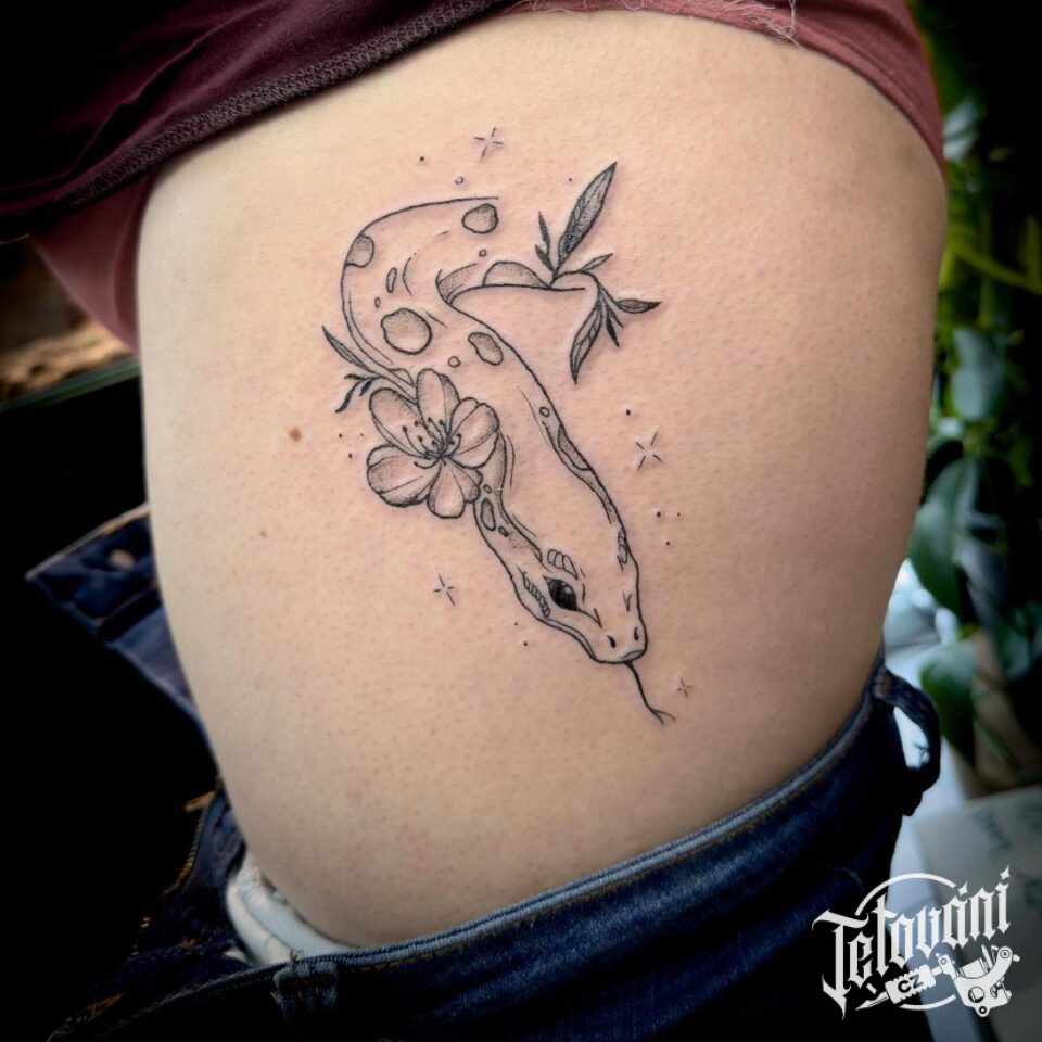 Tetování zvířata had a květiny na stehně