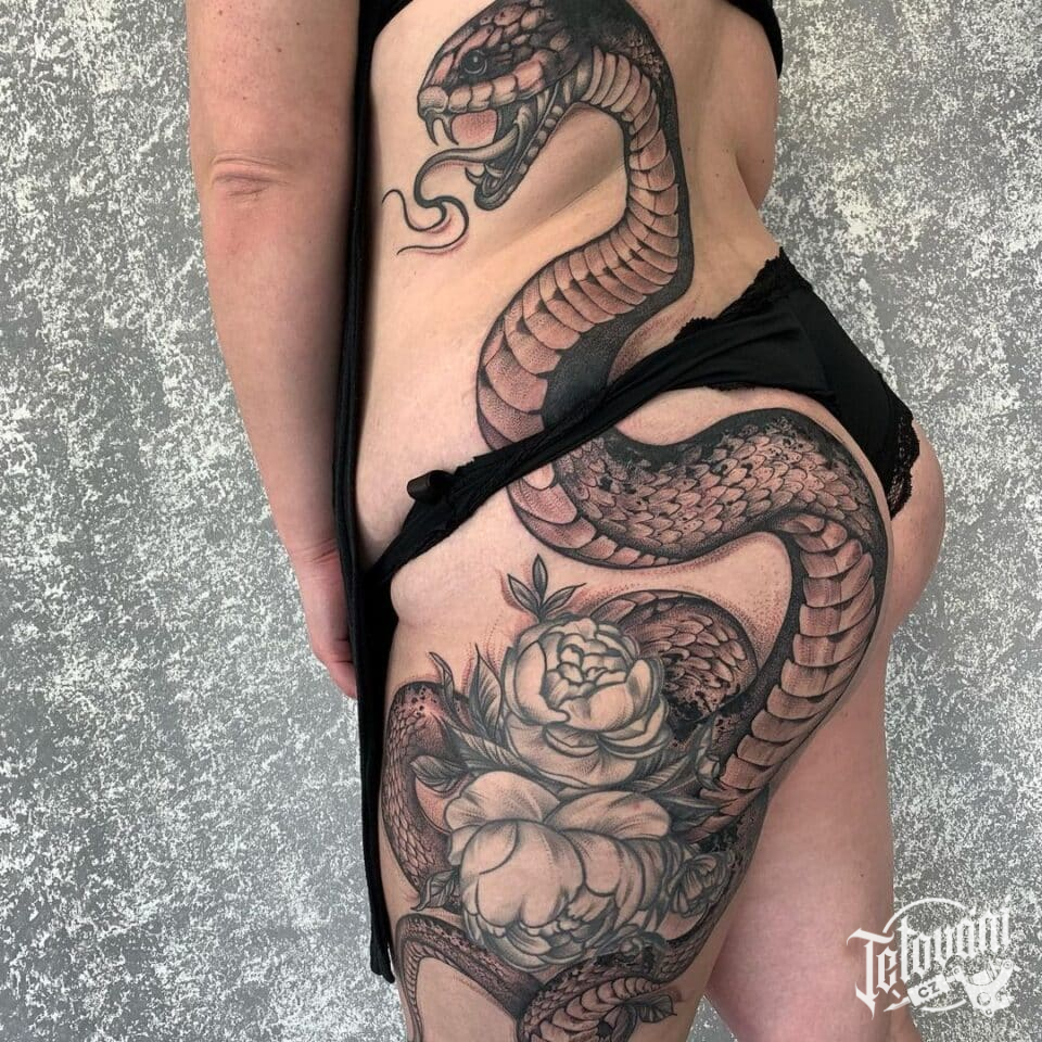Tetování zvířata, had a květiny, pivoňky na boku