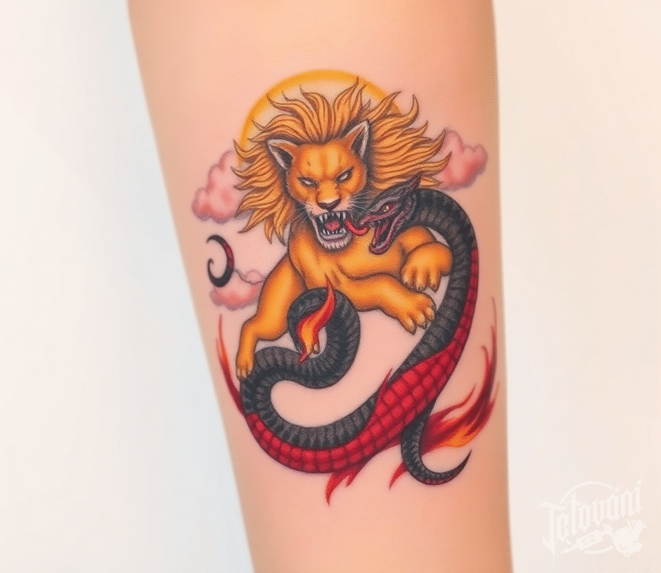 Tetování zvířata, had a lev, dobro a zlo na předloktí
