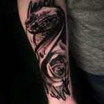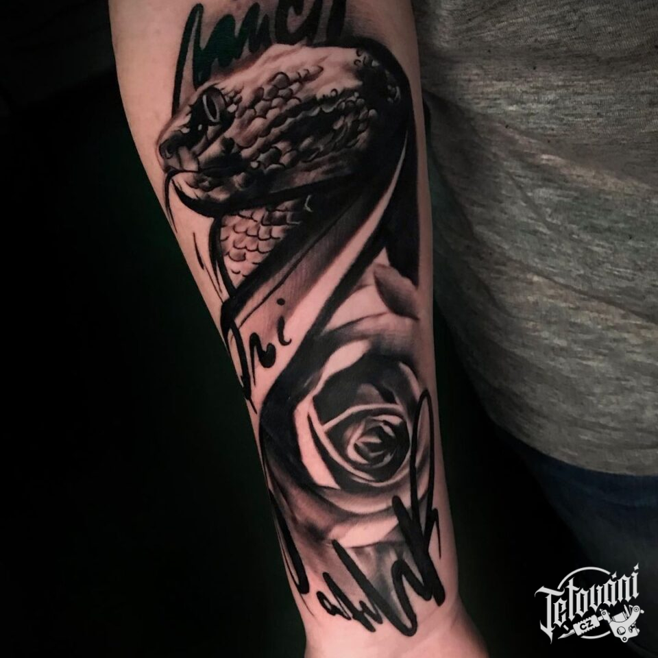 Tetování zvířata, had, květina, růže na předloktí