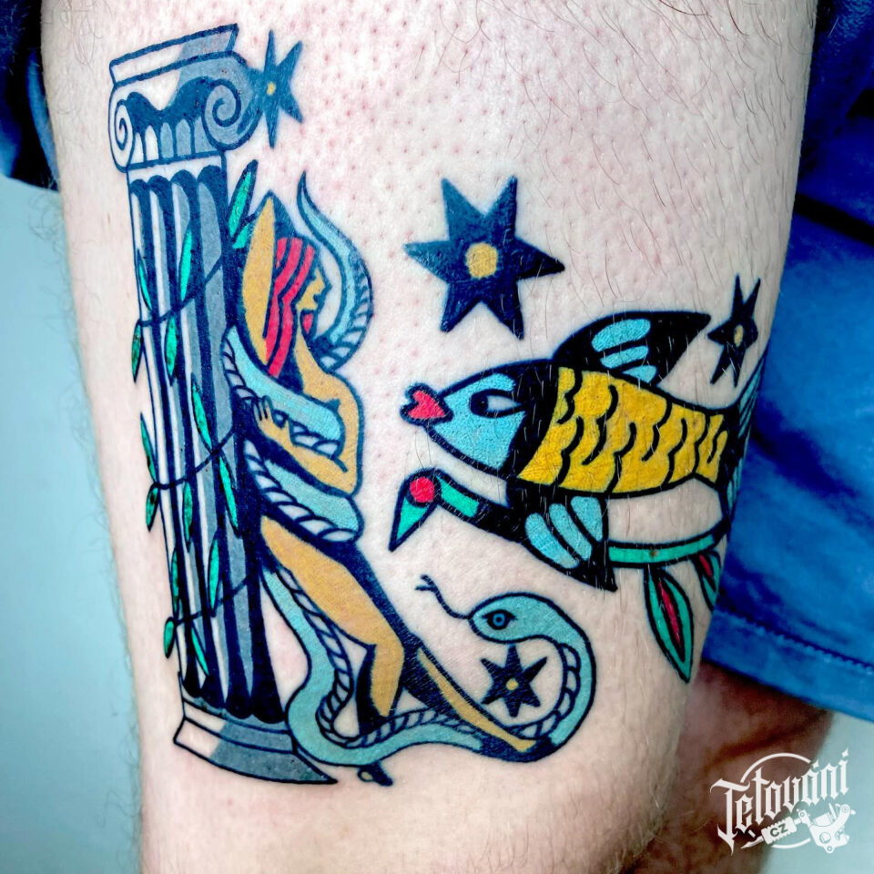 Tetování zvířata, had, ryba, žena na stehně