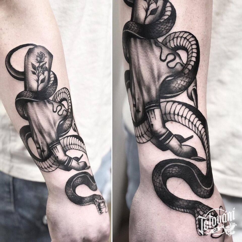 Tetování zvířata, had s rukou na předloktí