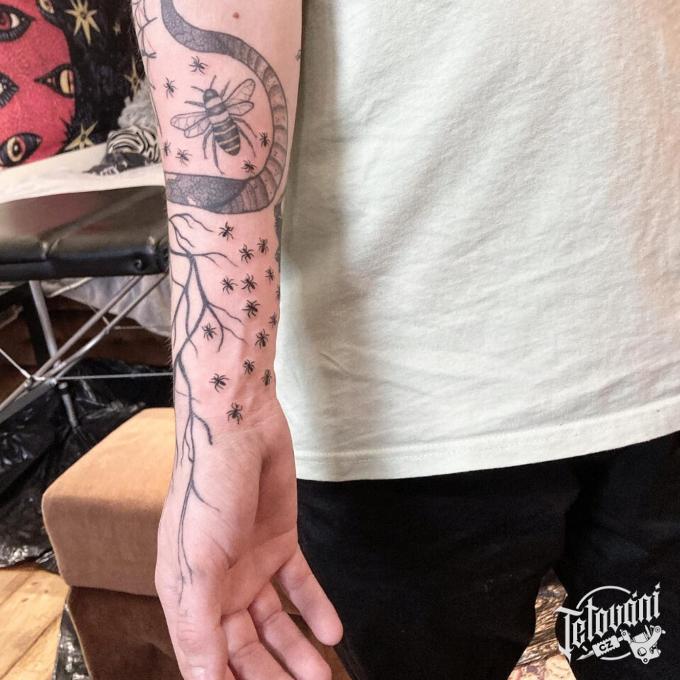 Tetování zvířata, had, včela, větvička, pavouci na předloktí