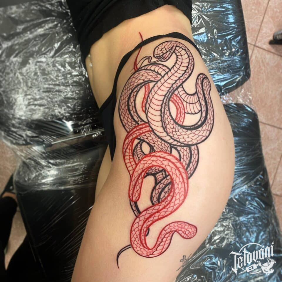 Tetování zvířata, hadi na boku stehna