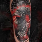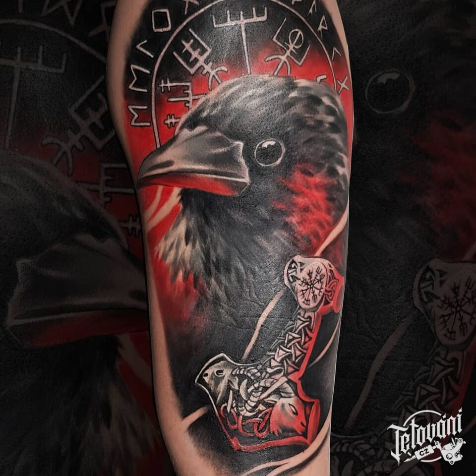 Tetování zvířata, havran a runa ochranné symboly na rameni