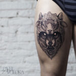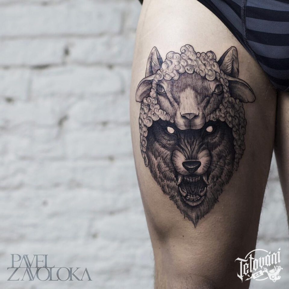 Tetování zvířata, hlava vlka s ovcí na stehně
