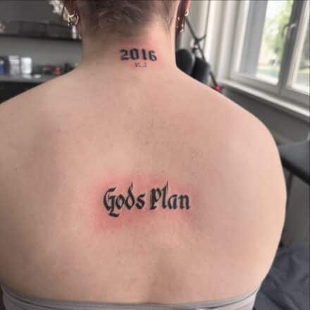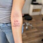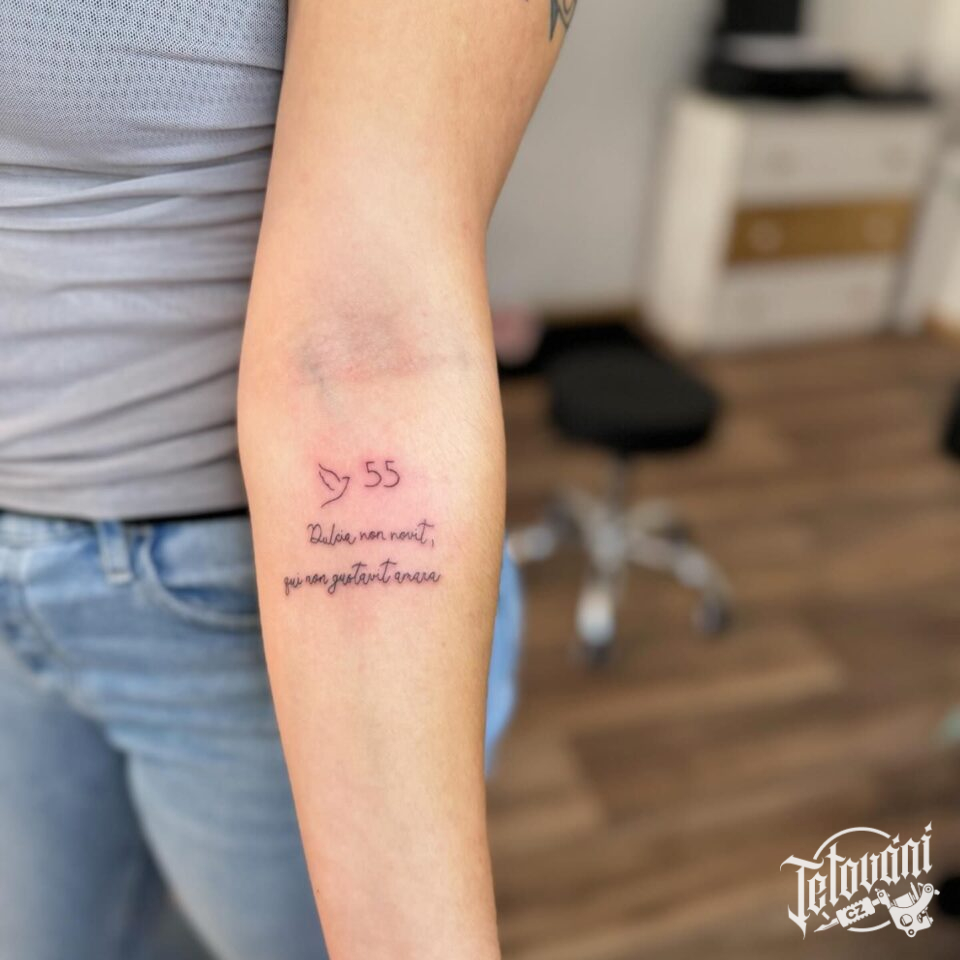 Tetování zvířata, holubice a nápisy, čísla a citát na předloktí