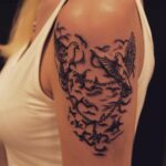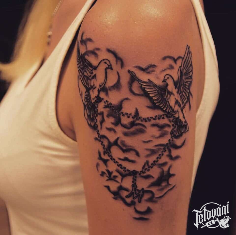 Tetování zvířata, holubice a řetízek s písmenem na rameno