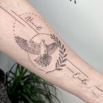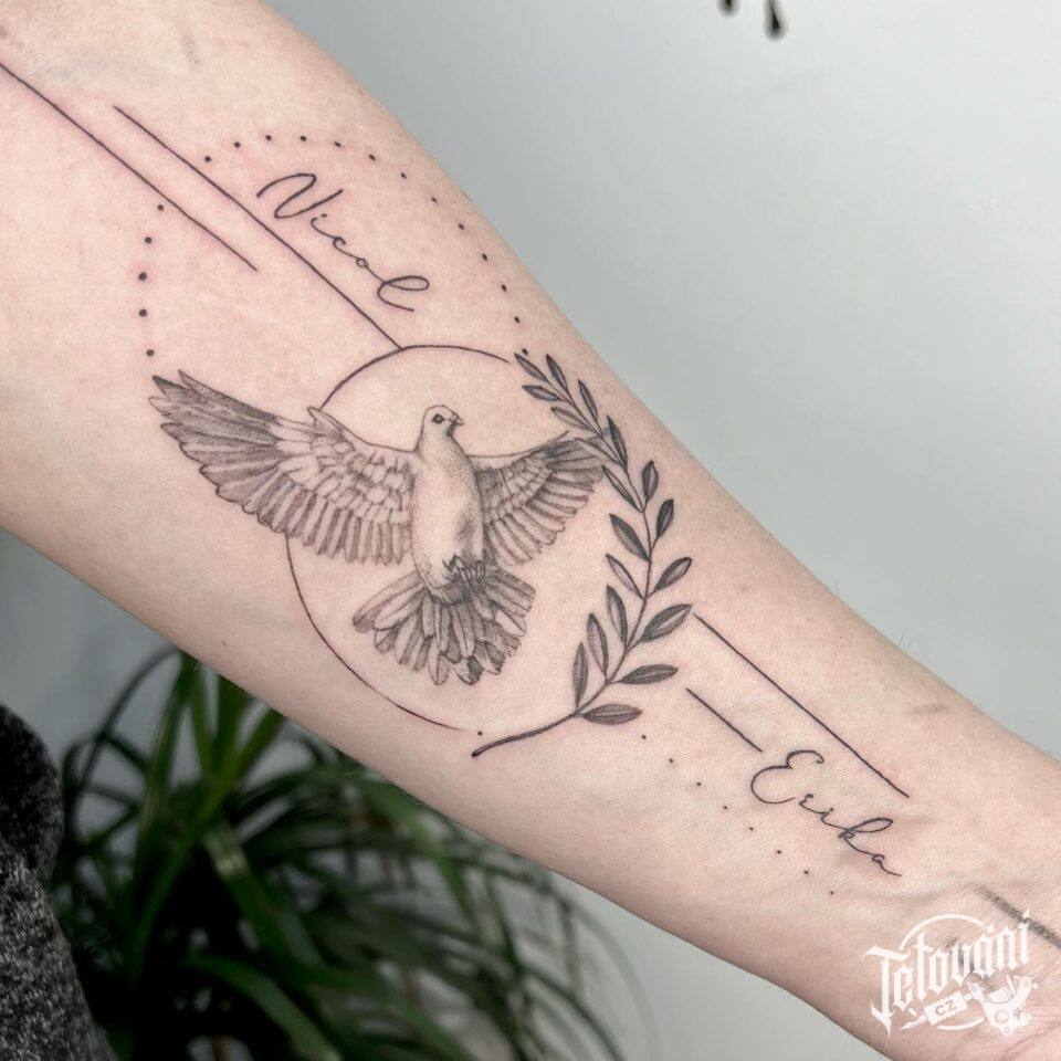 Tetování zvířata, holubice, čáry a jména na předloktí