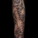 Tetování zvířata, holubice, květiny, růže a nápisy na rukávu