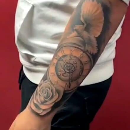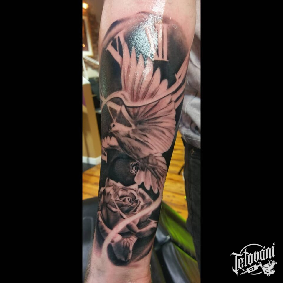 Tetování zvířata, holubice, růže, hodiny na předloktí
