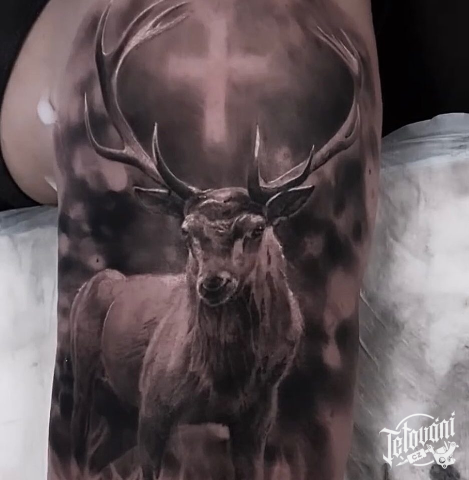 Tetování, zvířata, jelen, kříž, příroda, portrét na rameno