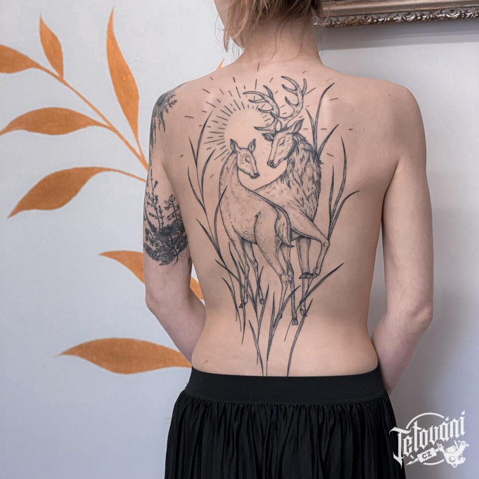 Tetování zvířata, jeleni, luční kvítí, slunce na záda