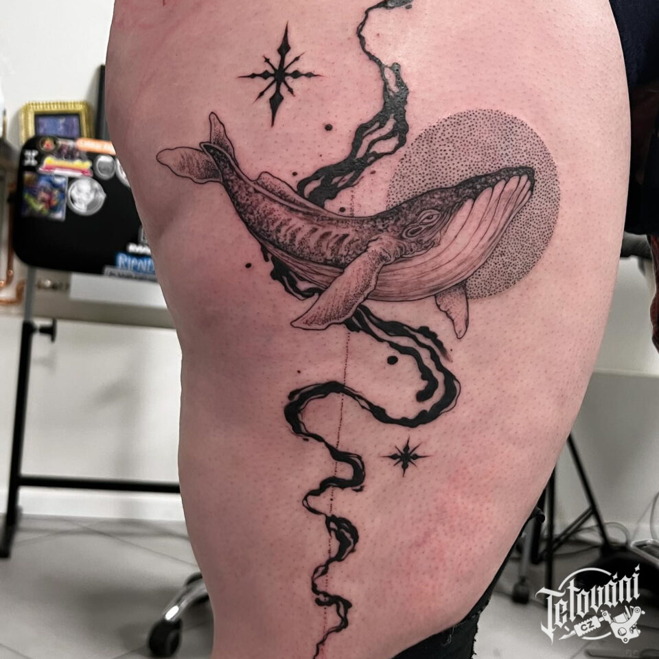 Tetování zvířata, keporkak na stehně