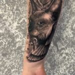 Tetování zvířata, kočka a symboly na předloktí