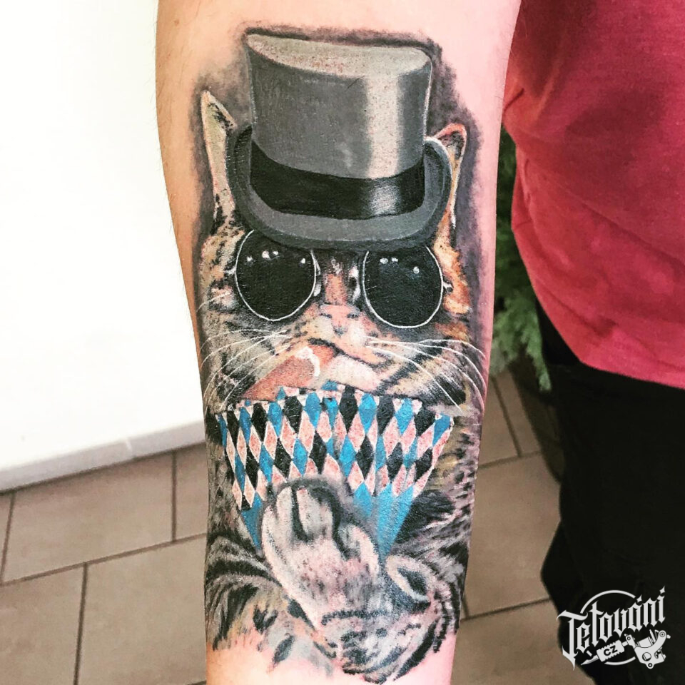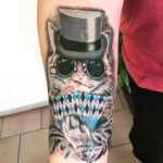 Tetování zvířata, kočka hrající karty na předloktí