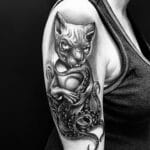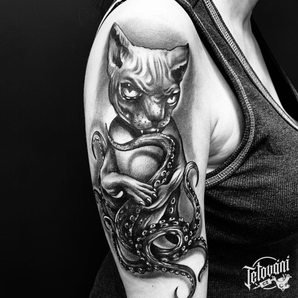 Tetování zvířata kočka s chobotnicí na rameno