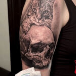 Tetování zvířata, kočka s lebkou na paži