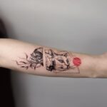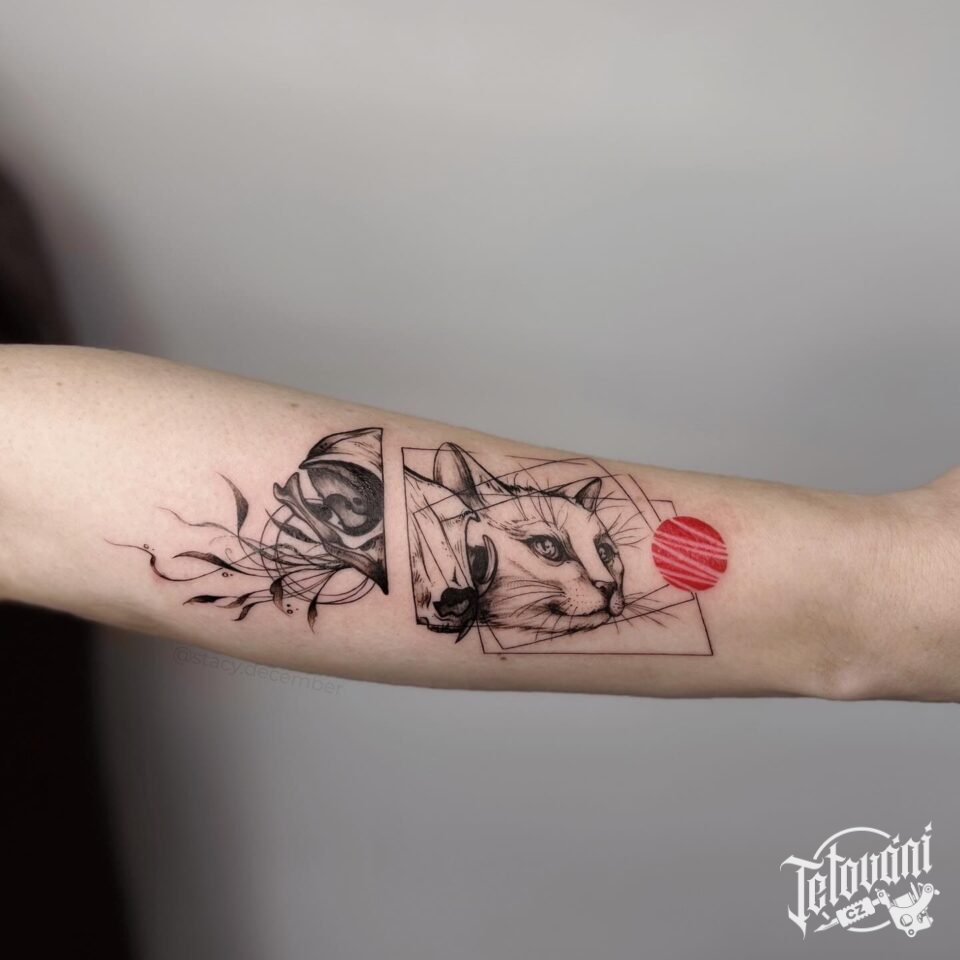 Tetování zvířata, kočka, větvička a čáry na předloktí