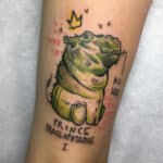 Tetování zvířata, koruna a nápisy na holeni