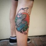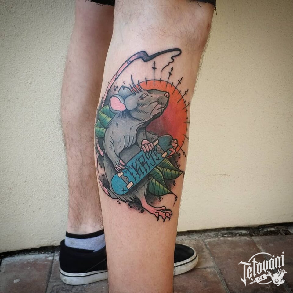 Tetování zvířata, krysa, slunce a znaky a symboly skateboard na lýtku
