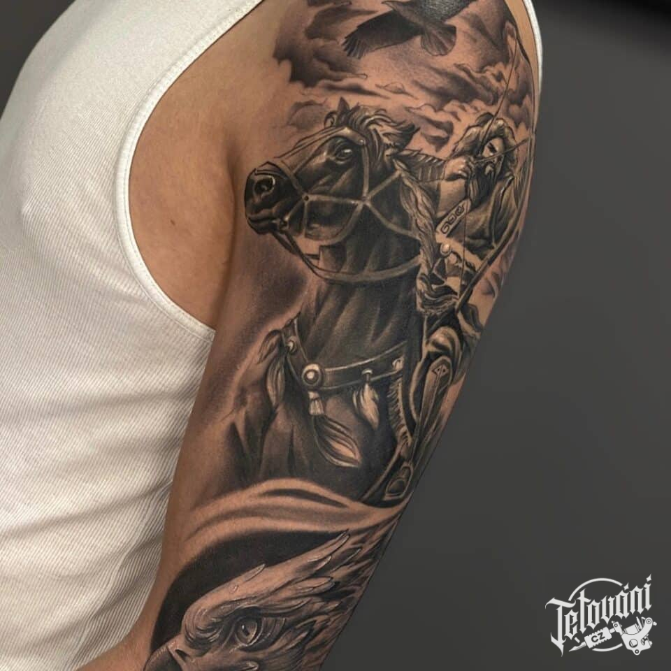 Tetování zvířata, kůň, ptáci a bojovník na rukávu