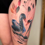 Tetování zvířata labutě a květiny na stehno
