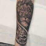Tetování zvířata, lev a hodiny na předloktí