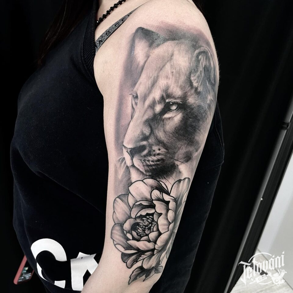 Tetování zvířata, lev a květiny růže na rameni