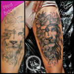 Tetování zvířata, lev a lev znamení zvěrokruhu, květiny na stehno