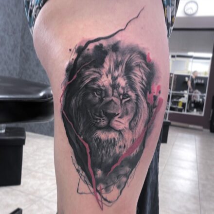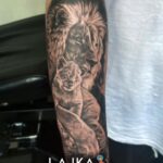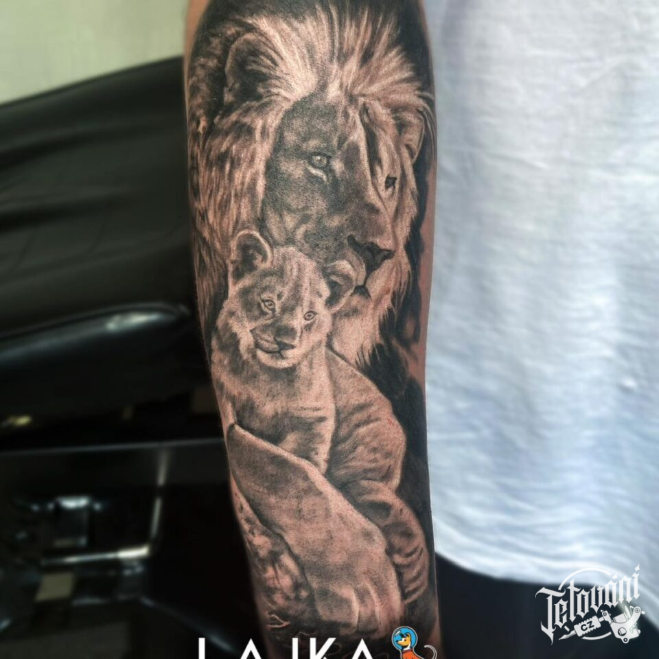 Tetování zvířata, lev a lev znamení zvěrokruhu na předloktí