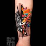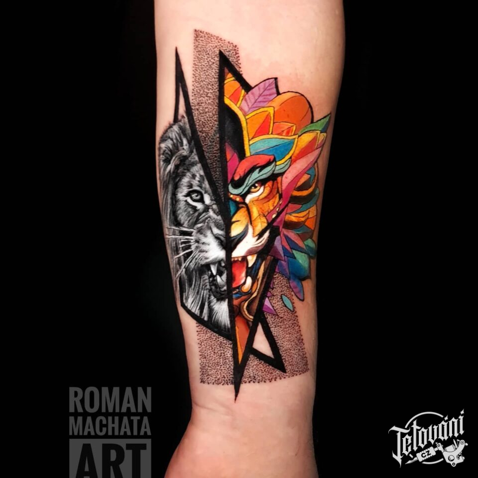 Tetování zvířata, lev a lev znamení zvěrokruhu na předloktí