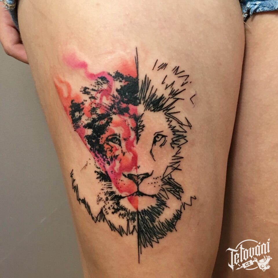 Tetování zvířata, lev a lev znamení zvěrokruhu na stehno