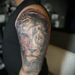 Tetování zvířata, lev a náboženství, portrét Ježíše na rameno