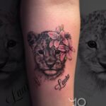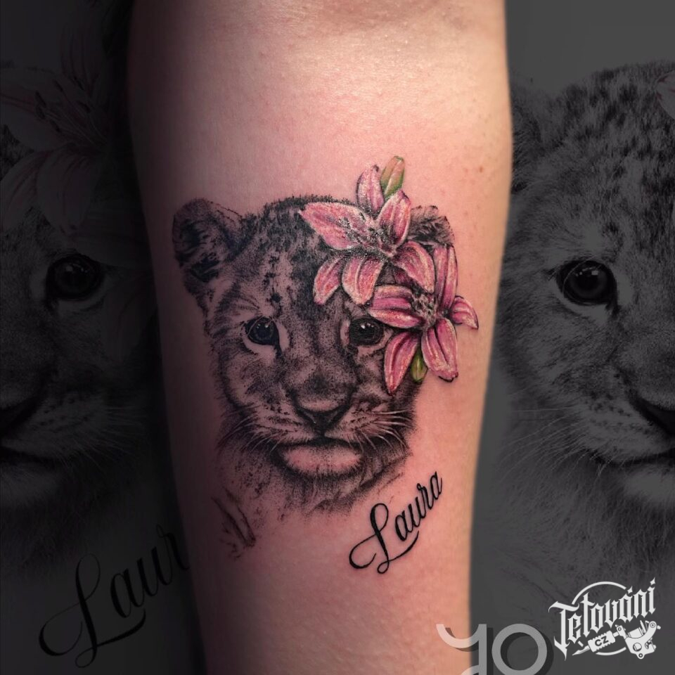Tetování zvířata, lev a nápisy, jméno na předloktí