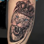 Tetování zvířata, lev a znamení zvěrokruhu, koruna na stehnu