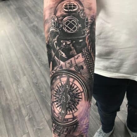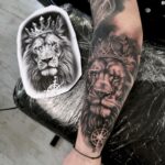 Tetování zvířata, lev a znamení zvěrokruhu lev, koruna a kompas na předloktí