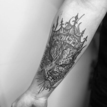 Tetování zvířata, lev, koruna, tvary na rameni