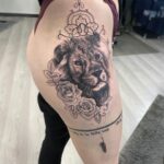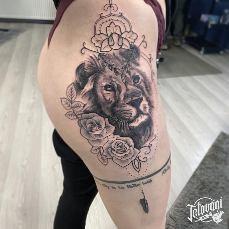 Tetování zvířata, lev, květiny, růže a ornamenty na boku stehna