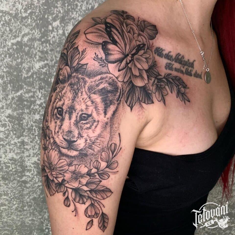 Tetování zvířata, lev, motýl a květiny na rameni