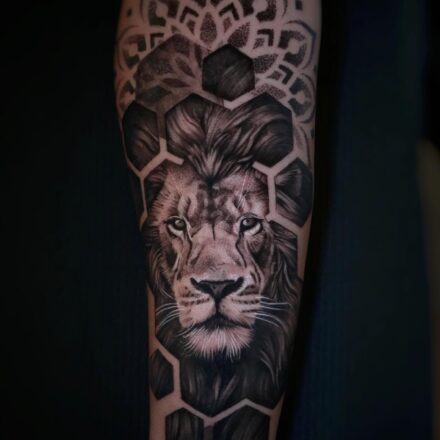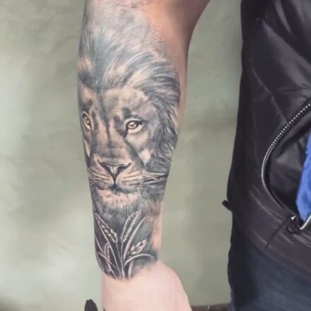 Tetování zvířata, lev, sova a sparťanský bojovník na rukávu