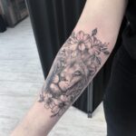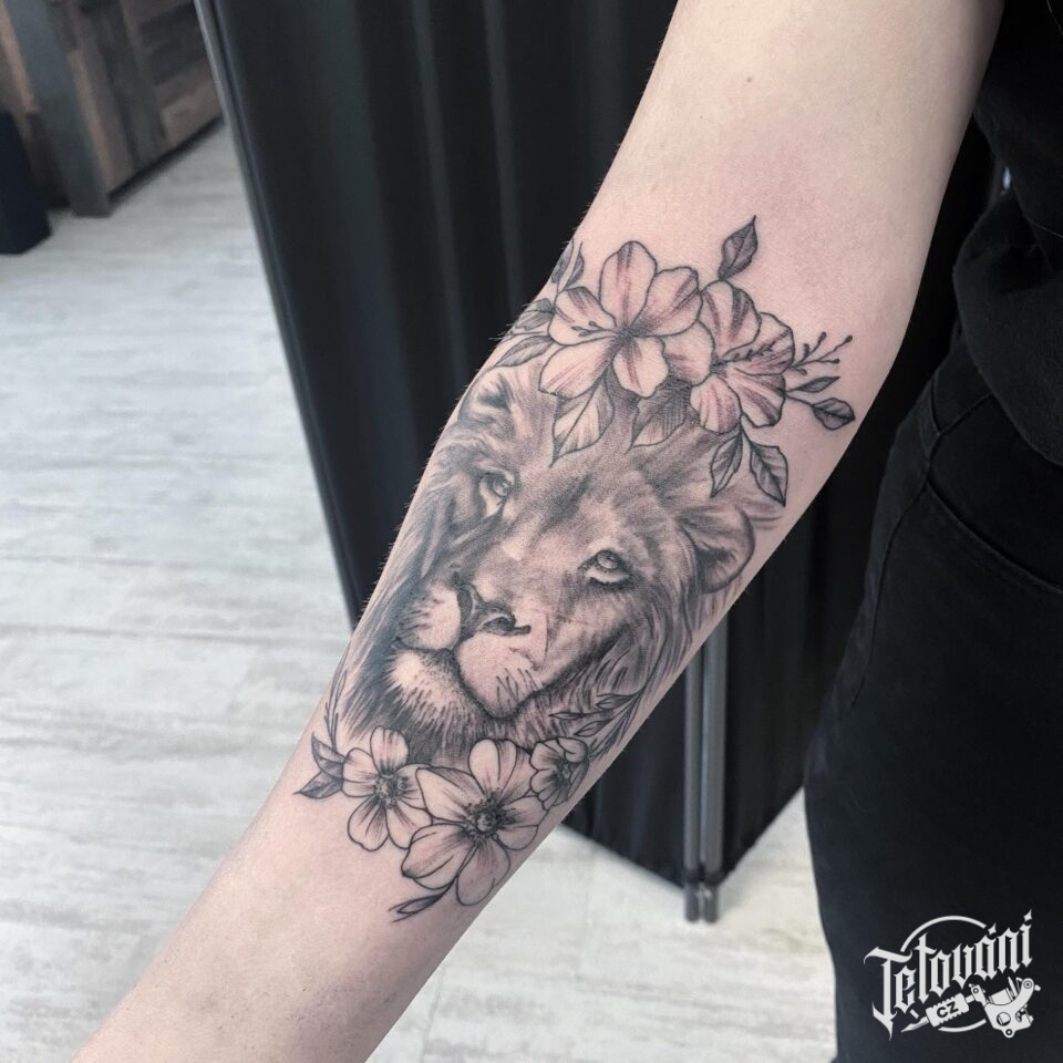 Tetování zvířata, lev znamení zvěrokruhu a květiny na předloktí